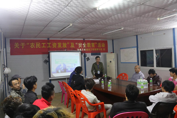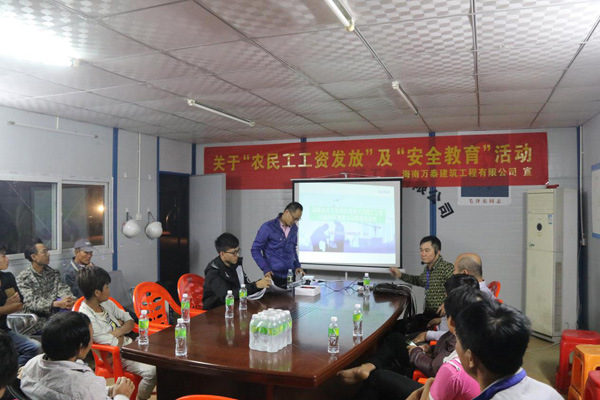 為做好年底農(nóng)民工工資正常發(fā)放事宜,落實工地安全文明管理,12月20日晚,海南萬泰組織相關人員深入??谑校捞m區(qū))示范性綜合實踐基地項目,開展農(nóng)民工資發(fā)放及安全教育培訓。