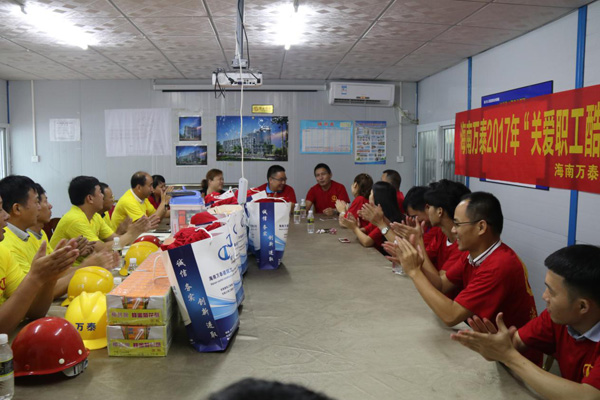 海南萬(wàn)泰在追求企業(yè)發(fā)展的同時(shí),始終把民工利益擺在重要位置,關(guān)愛(ài)民工工作生活。長(zhǎng)期以來(lái),海南萬(wàn)泰都對(duì)一線(xiàn)工人的生產(chǎn)生活格外重視,通過(guò)節(jié)日慰問(wèn)、送清涼等一系列活動(dòng),深切表達(dá)公司領(lǐng)導(dǎo)及同事對(duì)長(zhǎng)期駐扎一線(xiàn)的項(xiàng)目工人的關(guān)懷之情。