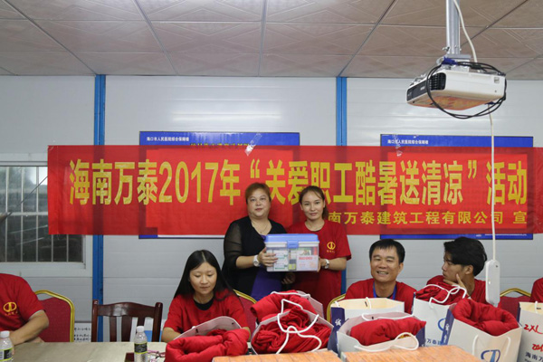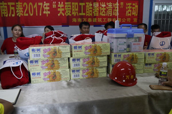 本次送清涼活動(dòng),海南萬(wàn)泰公司共送出14箱菊花茶,400件T恤以及部分應(yīng)急醫(yī)藥品。項(xiàng)目部林總代表項(xiàng)目工人對(duì)公司的關(guān)懷及慰問(wèn)表示由衷的感謝。