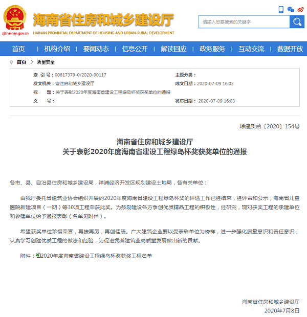 海南萬(wàn)泰清能·麗景灣一期建安工程喜獲省優(yōu)質(zhì)工程“綠島杯”獎(jiǎng)