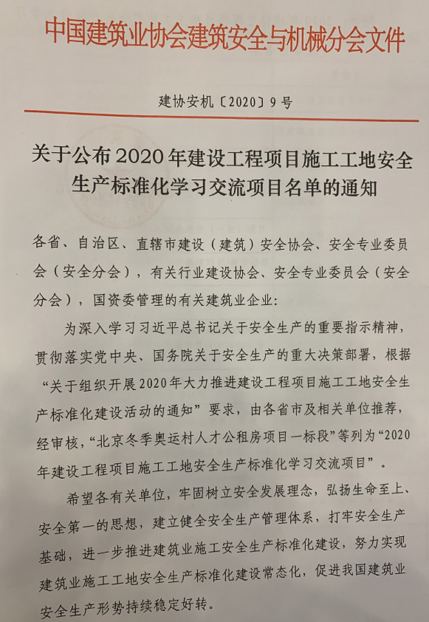 近日,建筑業(yè)安全生產(chǎn)管理經(jīng)驗交流會在北京鐵道大廈召開。本次會議由中國建筑業(yè)協(xié)會建筑安全與機械分會主辦,會議旨在貫徹落實黨中央和國務(wù)院關(guān)于安全生產(chǎn)的重大決策部署和住房和城鄉(xiāng)建設(shè)部對建筑業(yè)安全生產(chǎn)的新要求,發(fā)揮專家的作用,踐行科技引領(lǐng)、有效預(yù)防,分享經(jīng)驗,實現(xiàn)安全生產(chǎn)的目標(biāo)。會上公布了2020年全國建設(shè)工程項目施工工地安全生產(chǎn)標(biāo)準(zhǔn)化建設(shè)學(xué)習(xí)交流項目名單,我公司承建的兆南熙園(南區(qū)四期)喜獲“2020年全國建設(shè)工程項目施工工地安全生產(chǎn)標(biāo)準(zhǔn)化”殊榮。