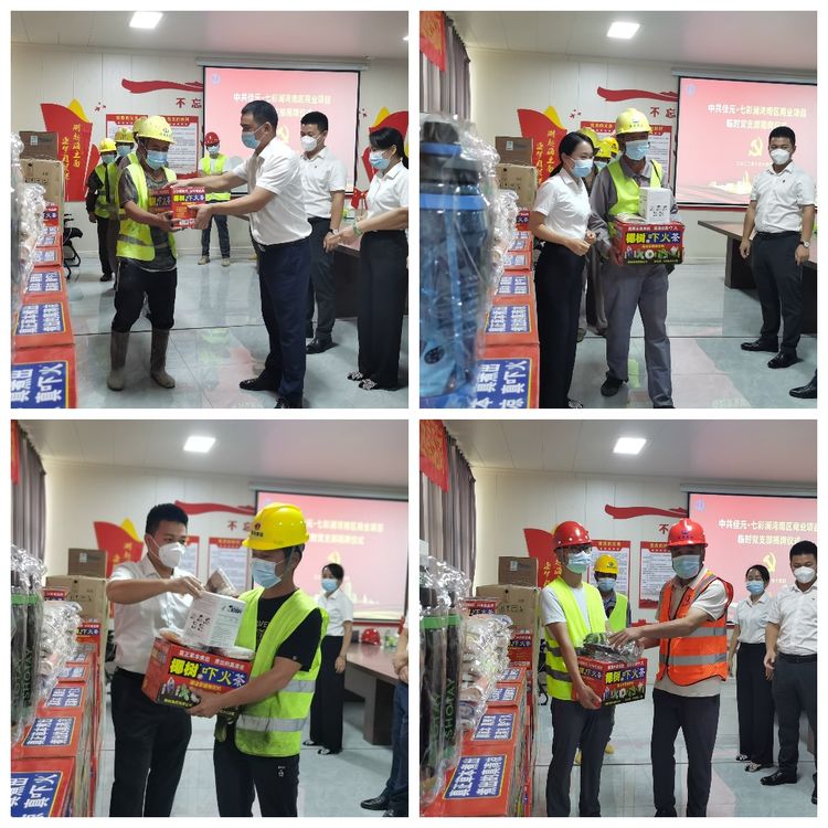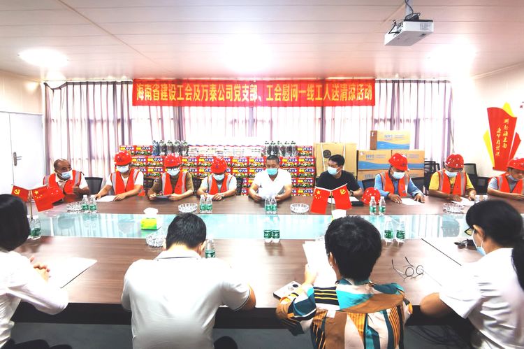 喜迎二十大,永遠(yuǎn)跟黨走。為進(jìn)一步提高黨組織在基層的影響力,增強黨組織在項目工地上的凝聚力,貫徹落實“項目建在哪,支部就設(shè)在哪”的理念,經(jīng)海南省住建行業(yè)黨委的批準(zhǔn),在黨的二十大召開前夕,萬泰公司承建的佳元·七彩瀾灣項目臨時黨支部揭牌儀式暨為一線工人送“清涼”活動在項目部現(xiàn)場圓滿舉辦。澄邁縣質(zhì)監(jiān)站黨支部書記、副站長蔡芙蓉、王培科長等一行,公司黨支部、工程部及項目有關(guān)人員參加了本次活動。