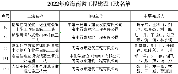 近日,由海南萬泰建筑工程有限公司申報的《大型主體公園復(fù)雜埋地管道精準(zhǔn)施工技術(shù)》《復(fù)雜外立面高層建筑附著式電動提升作業(yè)平臺施工工法》《高層住宅全現(xiàn)澆混凝土填充外墻施工工法》《精確控制泥漿下灌注樁混凝土施工頂標(biāo)高施工工法》《新型可調(diào)節(jié)式盤扣橫桿施工工法》共5項省級工法通過省住建廳評審,并頒發(fā)了相應(yīng)省級工法證書。據(jù)悉,這5項省級工法是公司的個別工程項目經(jīng)過實踐總結(jié)出來的技術(shù)成果,具有良好的安全性、經(jīng)濟性和適用性,可提高工效、縮短工期、大幅降低工程成本。此次通過的省級工法,是萬泰在工程施工技術(shù)方面的重大創(chuàng)新,后續(xù)我司將廣泛推廣至各工程項目中加以應(yīng)用。