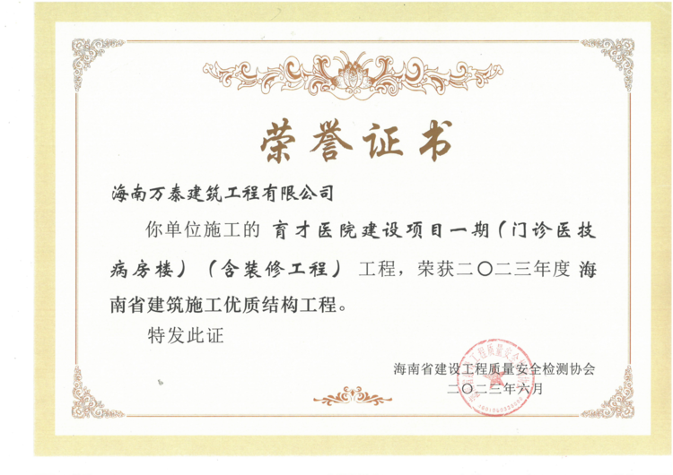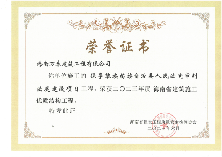 近日,由公司承建的育才醫(yī)院建設(shè)項目一期、保亭黎族苗族自治縣人民法院審判法庭建設(shè)項目、亨通·南湖花園分別通過了海南省建設(shè)工程質(zhì)量安全檢測協(xié)會的評審,被評為“2023年度海南省建筑施工優(yōu)質(zhì)結(jié)構(gòu)工程”。該獎項代表著全省建筑工程結(jié)構(gòu)施工質(zhì)量的領(lǐng)先水平,是精品工程的重要標(biāo)志。