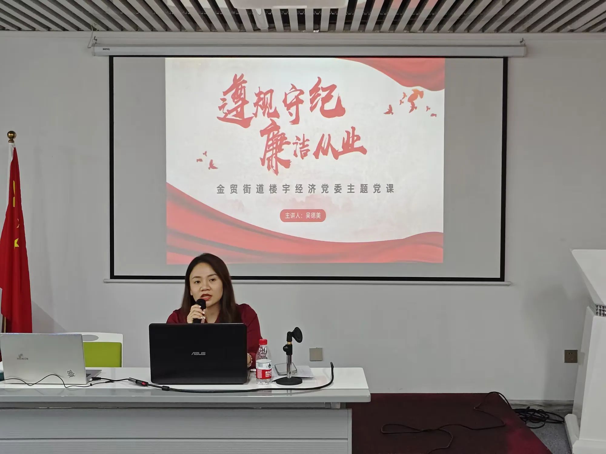 活動中,金貿(mào)街道樓宇經(jīng)濟黨委書記吳德美以“遵規(guī)守紀 廉潔從業(yè)”為主題為大家講授了一堂深刻的黨課,從廉潔從業(yè)的有關(guān)規(guī)定、意義、企業(yè)關(guān)鍵崗位廉潔風(fēng)險點及防控措施、警示案例等多方面強調(diào)了廉潔從業(yè)的重要性。