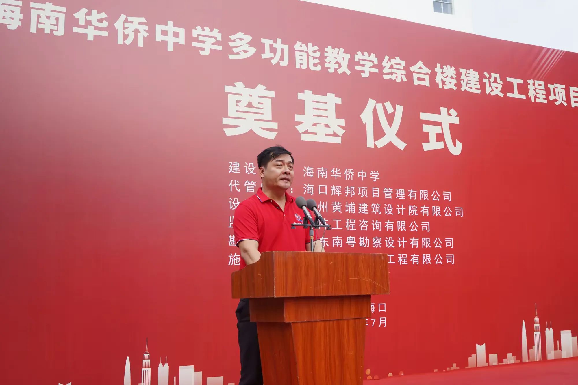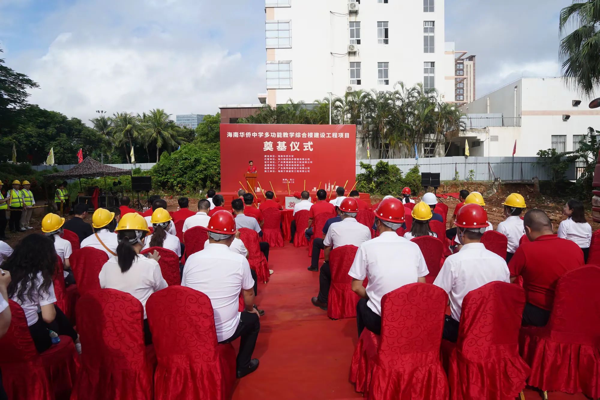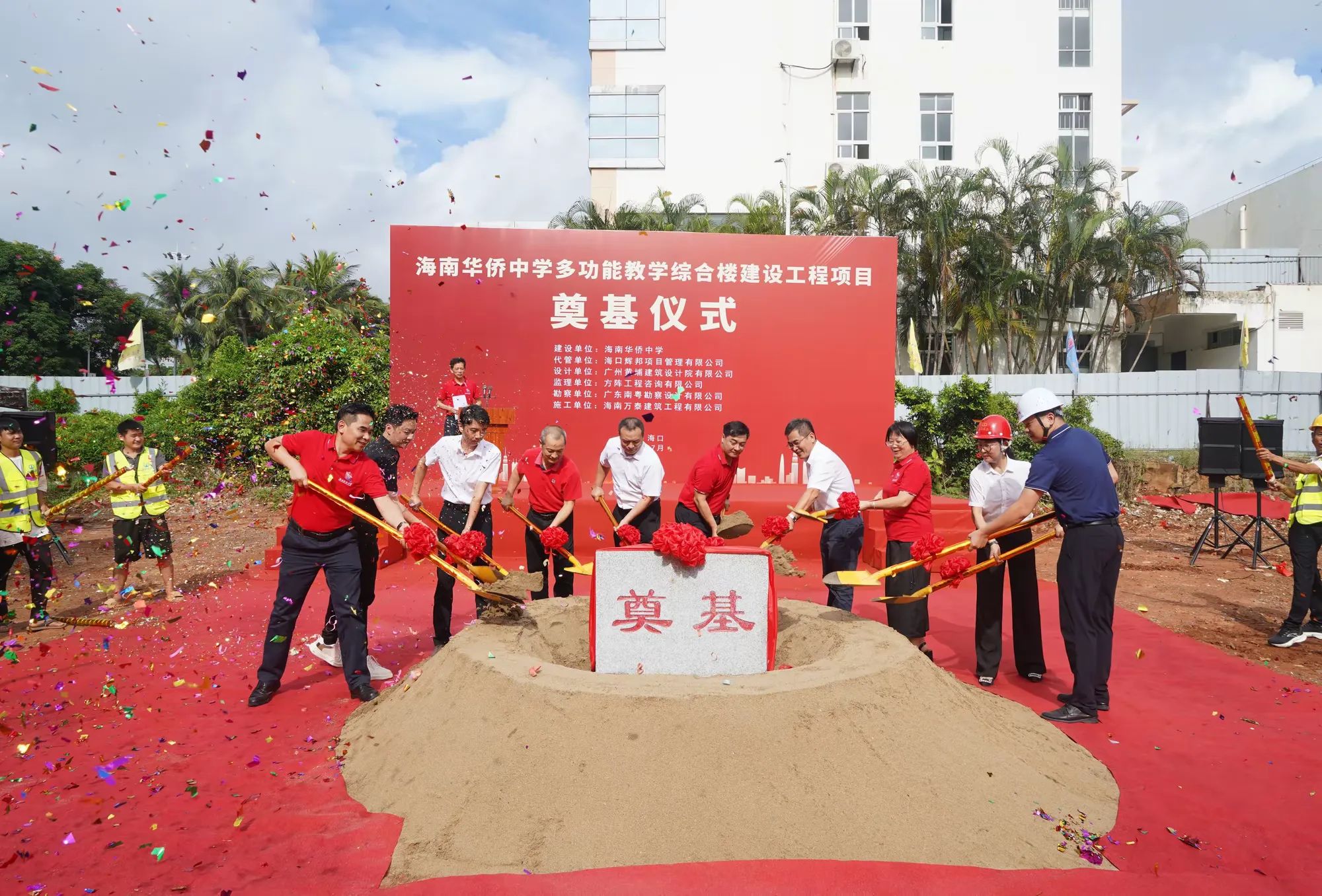 七月綠意爭相艷,書生意氣冠瓊州。7月19日,由海南萬泰建筑工程有限公司承建的海南華僑中學(xué)多功能教學(xué)綜合樓建設(shè)工程項(xiàng)目舉行開工儀式。??谑邪l(fā)改委黨組成員、副主任莊華東,海南華僑中學(xué)黨委副書記、校長張偉,黨委委員、副校長吳撼宇,??谑谐峭都瘓F(tuán)黨委副書記、董事、總經(jīng)理孫傳志以及代管、監(jiān)理、施工單位相關(guān)人員參加了本次活動(dòng)。儀式由海南華僑中學(xué)副校長吳澤純主持。