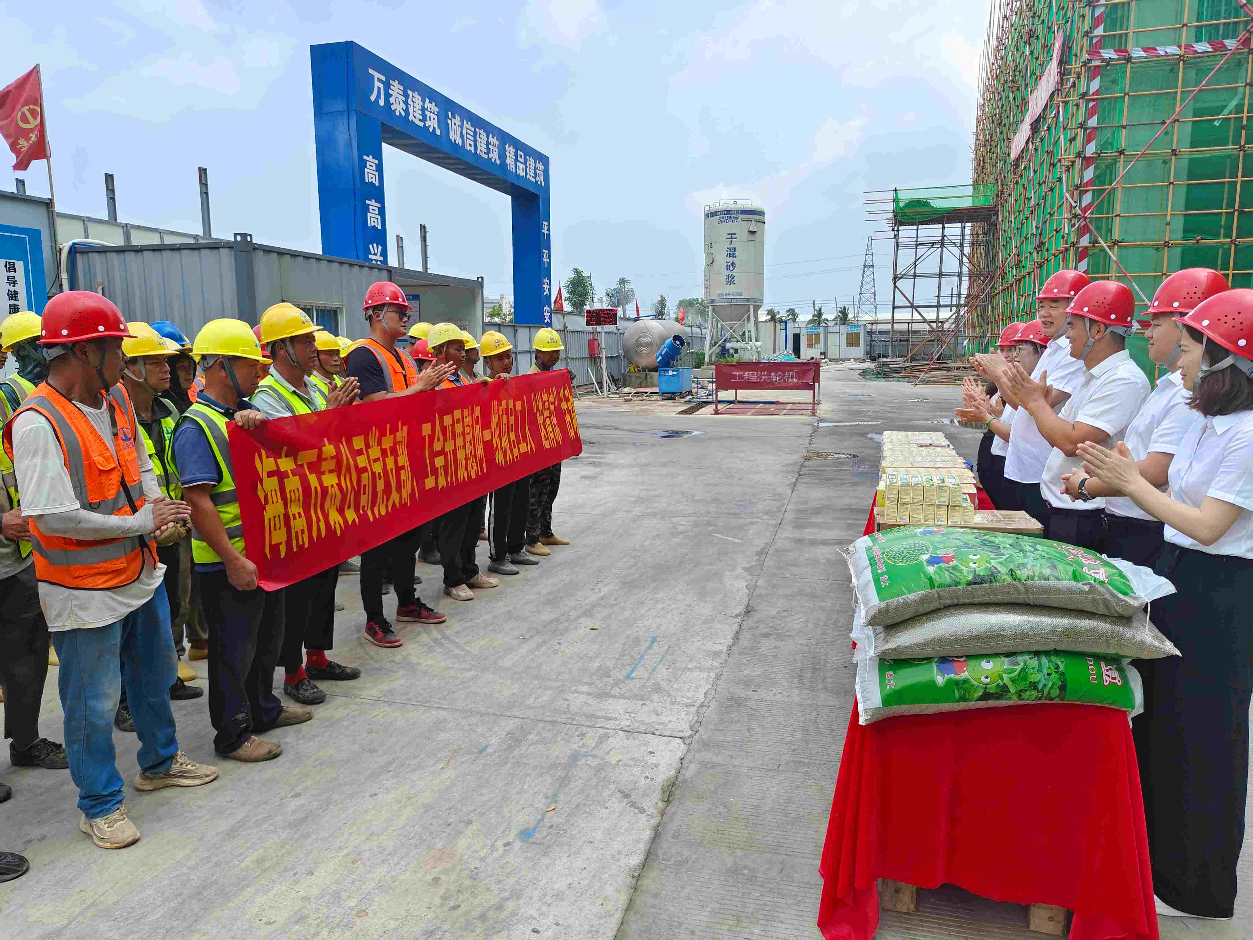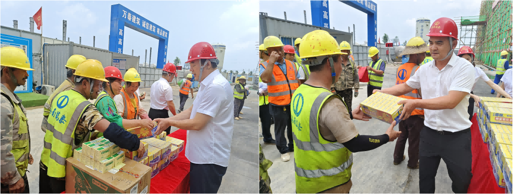 炎炎夏日送清涼,點點滴滴暖人心。427日、30日,為表達(dá)對堅守在工作崗位的項目一線工友的關(guān)懷與敬意,在五一國際勞動節(jié)即將到來之際,海南萬泰公司總經(jīng)理顏利帶隊赴海口江東新區(qū)國際消費精品產(chǎn)業(yè)港等項目現(xiàn)場,開展了“送清涼,暖人心”慰問活動,為廣大一線工友們送去節(jié)日祝福和清涼物資。公司黨支部、工會及相關(guān)部門負(fù)責(zé)人參加了本次活動。