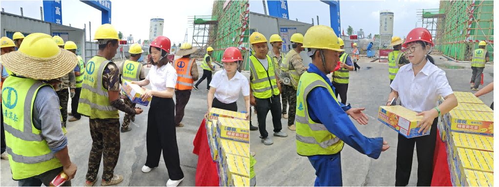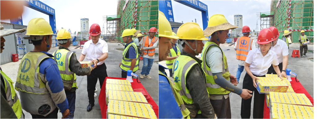 在活動中,顏利首選了解了項目的建設(shè)情況以及工人作業(yè)安全保障工作,叮囑工友們要注意提高防范意識,勞逸結(jié)合,做好夏日防暑工作,保護(hù)好自身安全,以更飽滿的熱情和昂揚的斗志,投入到工作中去,為項目早日竣工貢獻(xiàn)力量。隨后,大家共同為工友們送去了下火茶、綠豆、消暑藥品等清涼物資以及節(jié)日祝福。