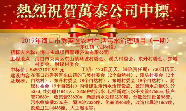 熱烈祝賀海南萬泰中標(biāo)2019年??谑行阌^(qū)農(nóng)村生活污水治理項(xiàng)目(一期)-東山鎮(zhèn)(四標(biāo)段)