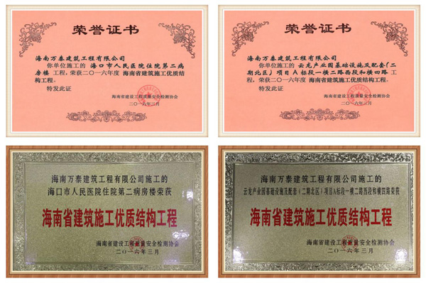 2016年3月,由海南萬(wàn)泰建筑工程有限公司承建的“??谑腥嗣襻t(yī)院住院第二病房樓”及“云龍產(chǎn)業(yè)園基礎(chǔ)設(shè)施及配套(二期)項(xiàng)目”工程被海南省建設(shè)工程質(zhì)量安全檢測(cè)協(xié)會(huì)評(píng)為《海南省建筑施工優(yōu)質(zhì)結(jié)構(gòu)工程》榮譽(yù)稱(chēng)號(hào)。